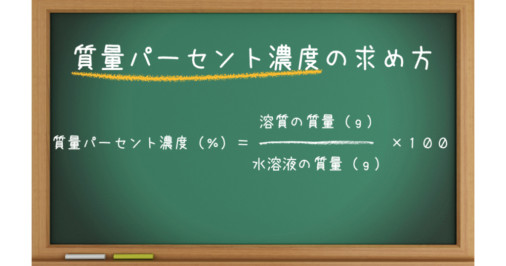 ・質量パーセント濃度の意味と、濃度計算の基本公式が理解できる