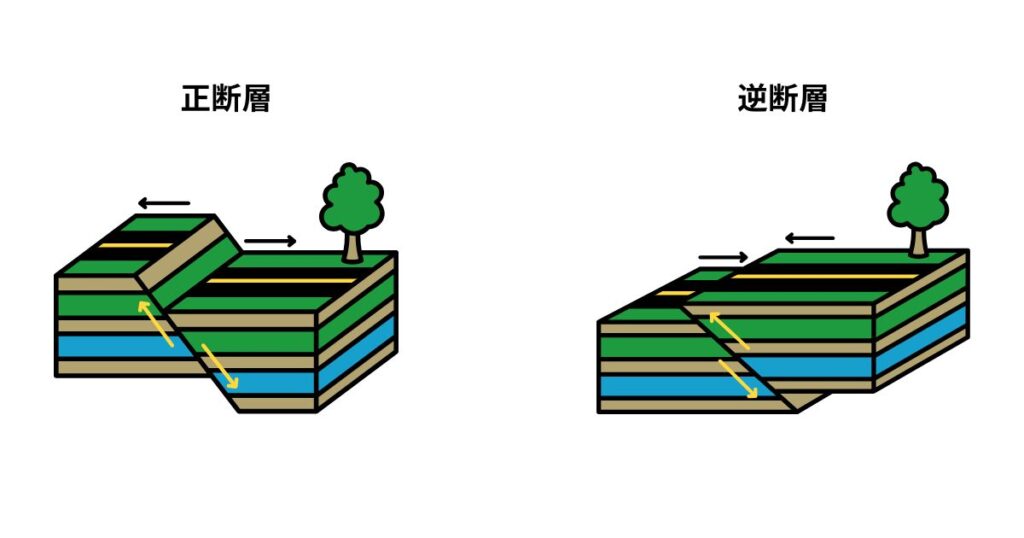 正断層と逆断層の主な違いは、断層面上盤(浅い側)のずれの方向にあります。