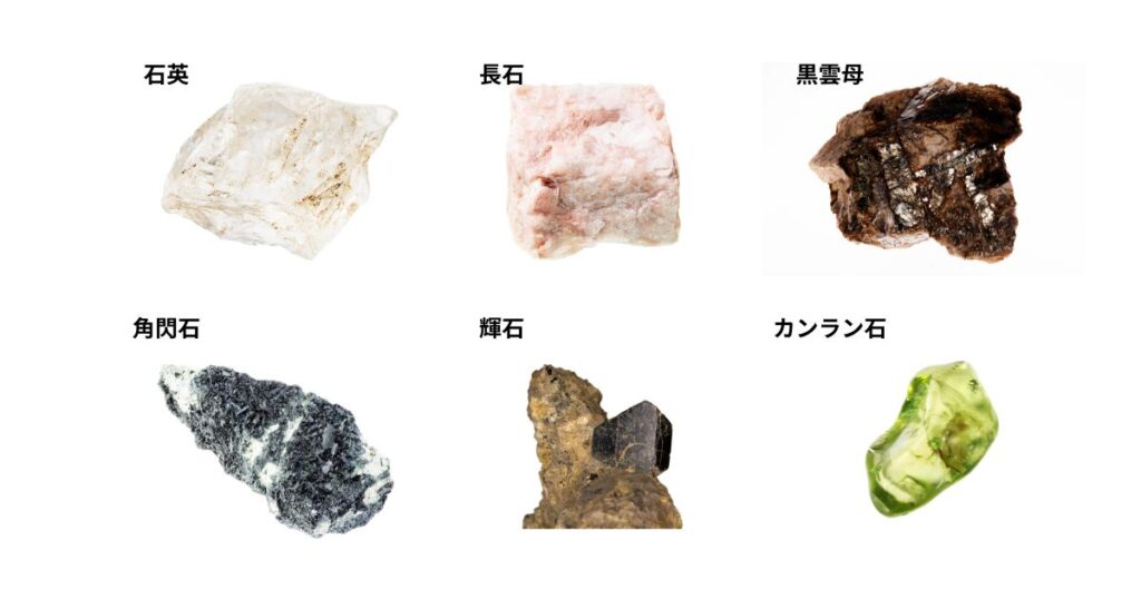 ・石英・長石・黒雲母・角閃石など主要な鉱物の特徴と見分け方がわかる